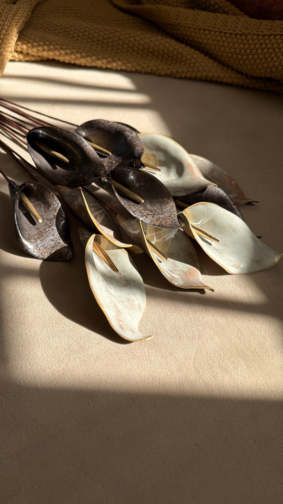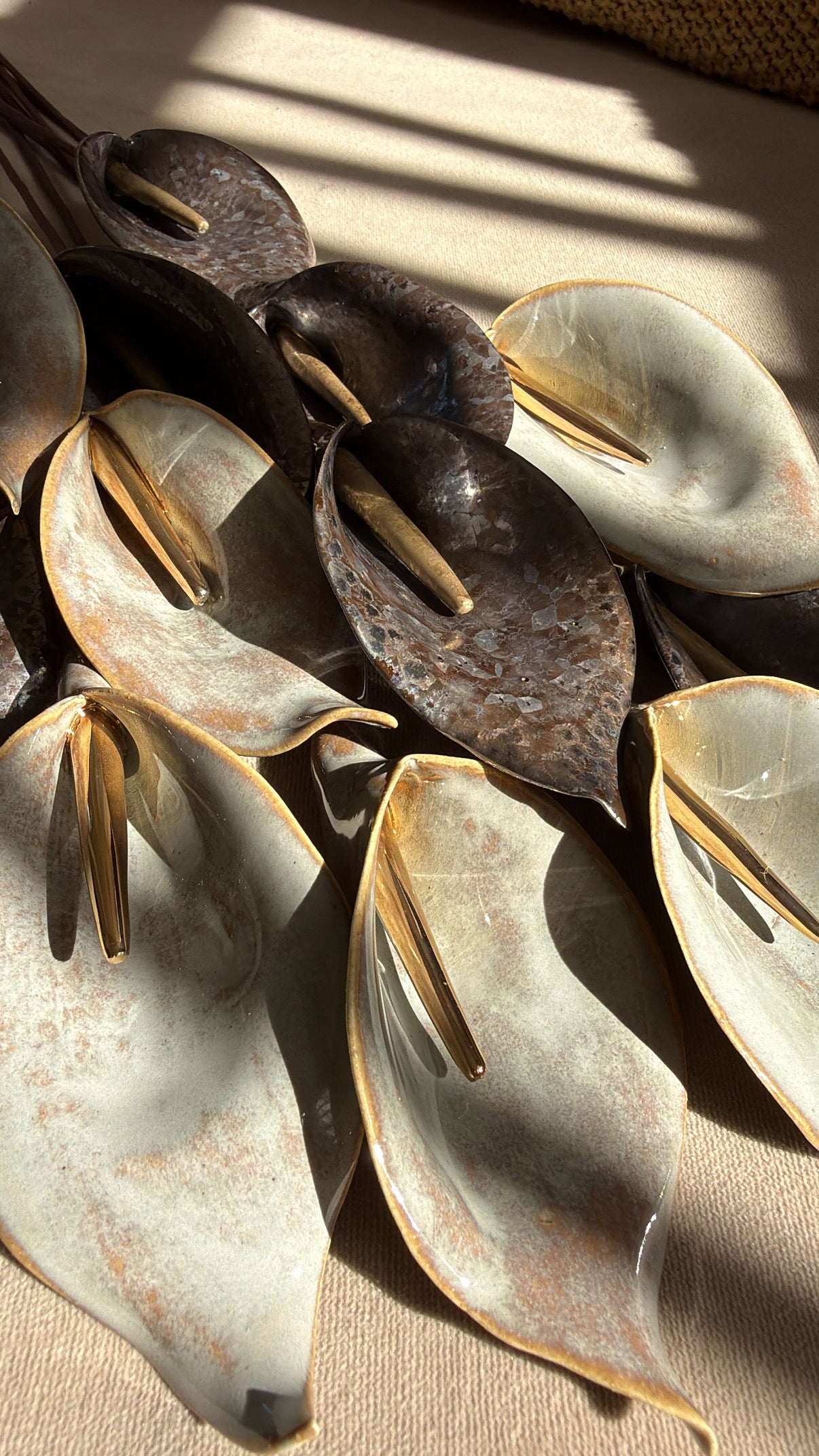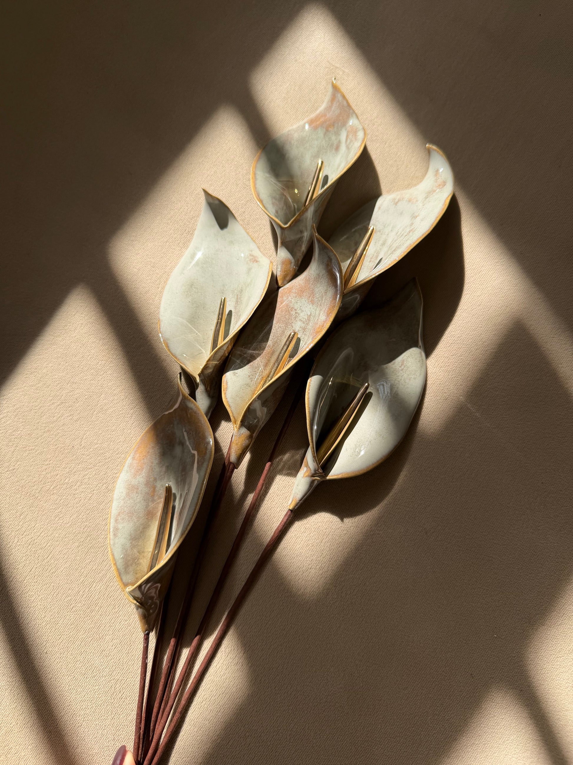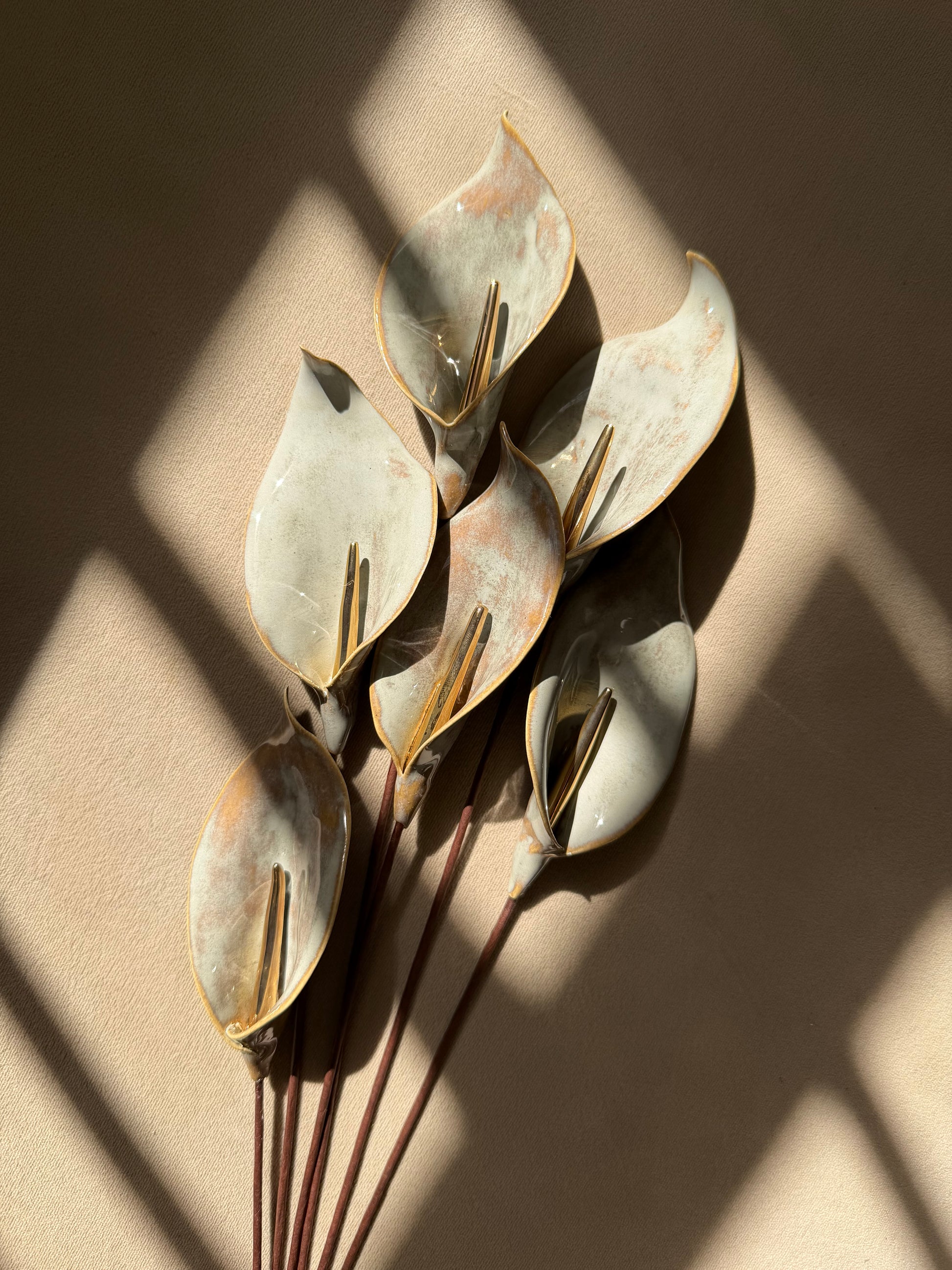 Beautiful hand-crafted lilies in stoneware. Each piece has been fired three times, glazed in a soft sky-blue tone, and finished with a pistil accented in 11% real gold.