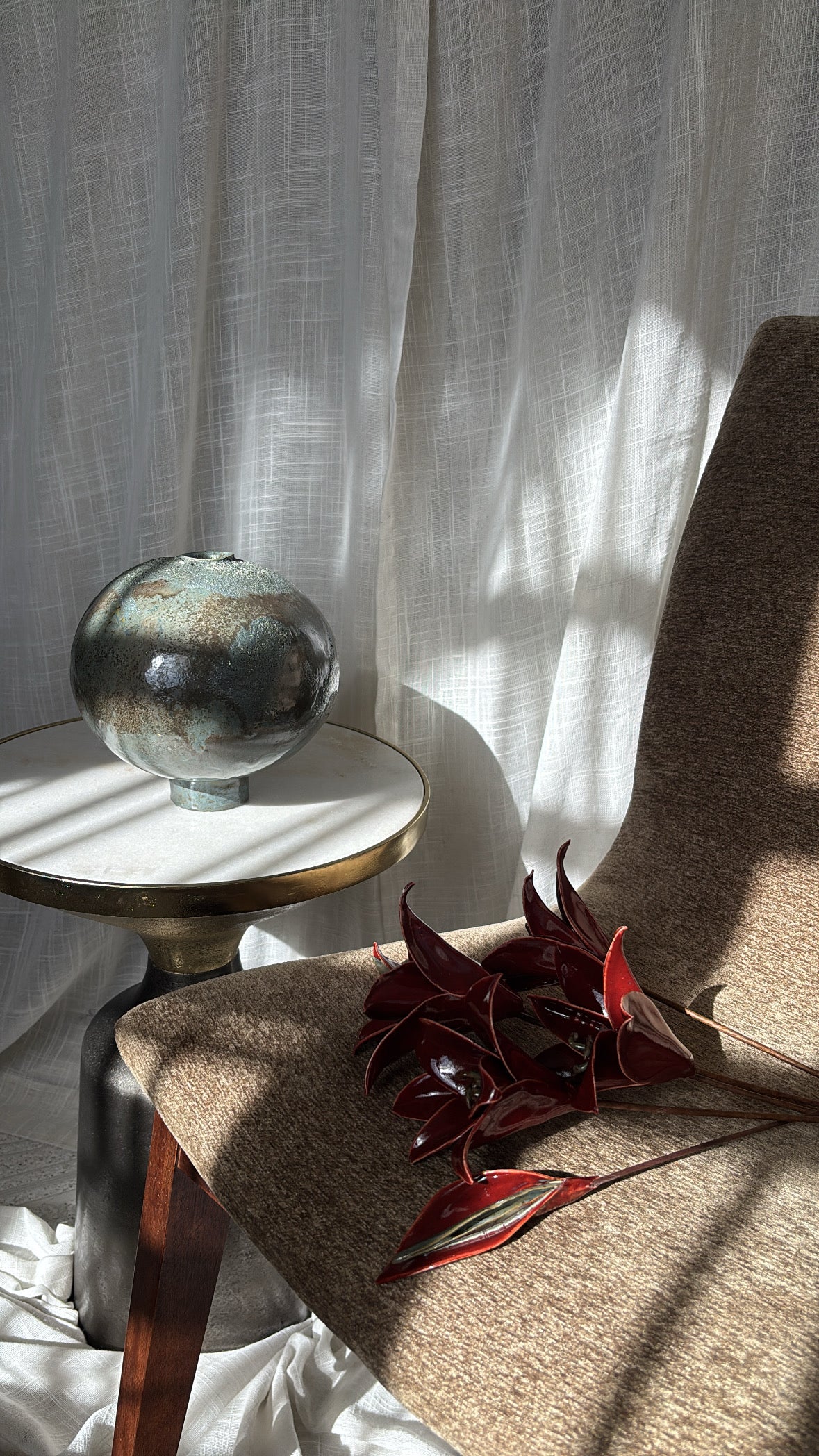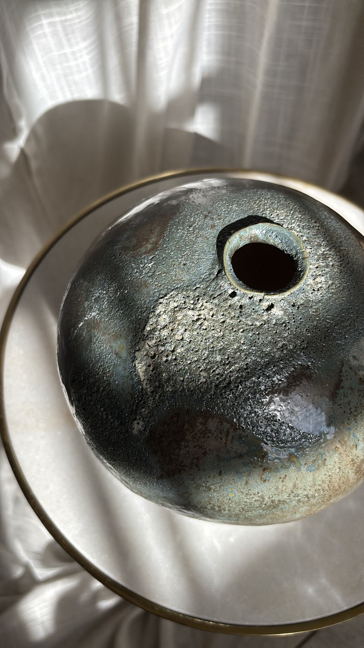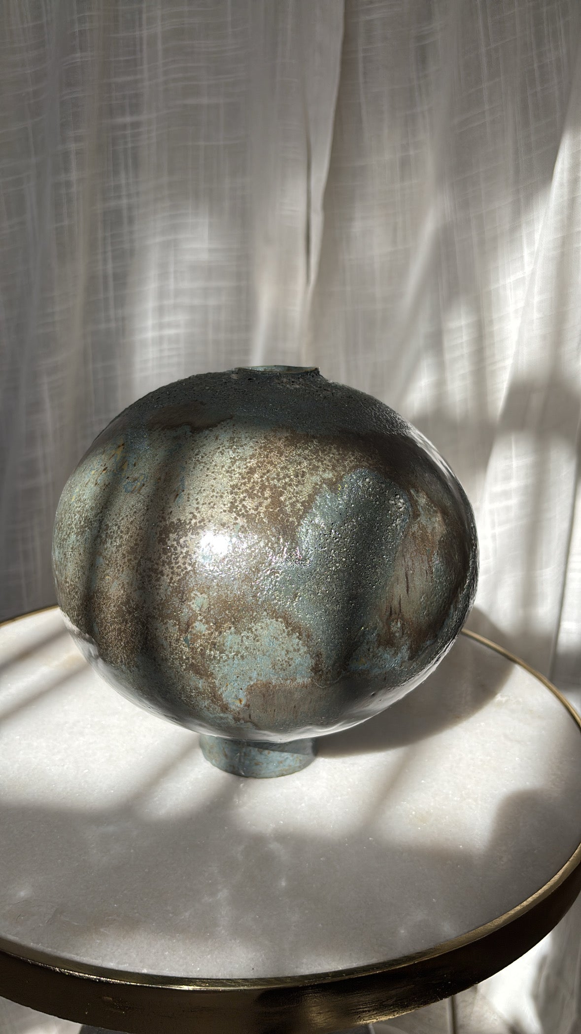 Organic round form with flowing shades of moss green and earthy bronze. A timeless piece that embraces the natural movement of glaze and light. Handmade in stoneware — each vase is one of a kind.