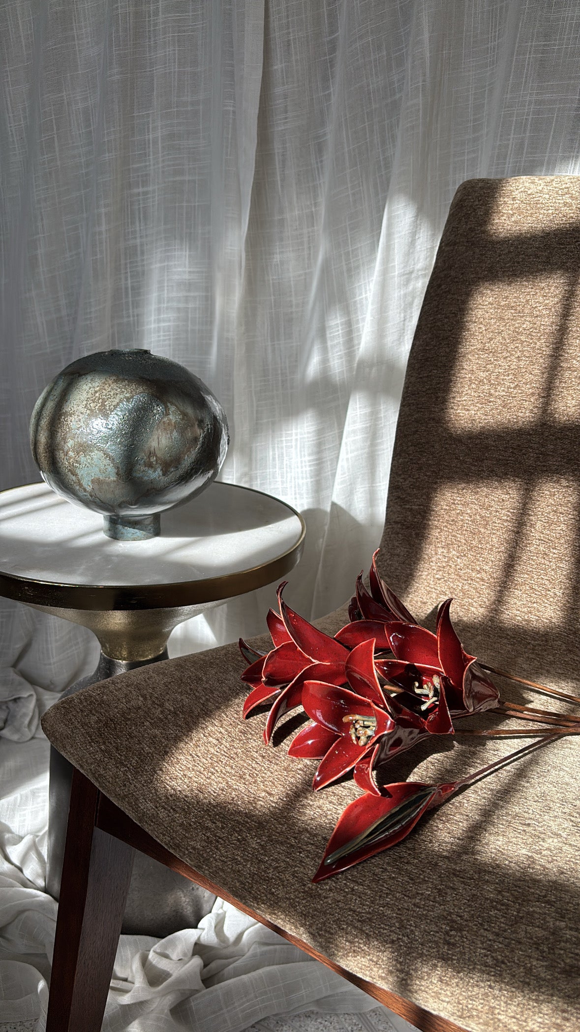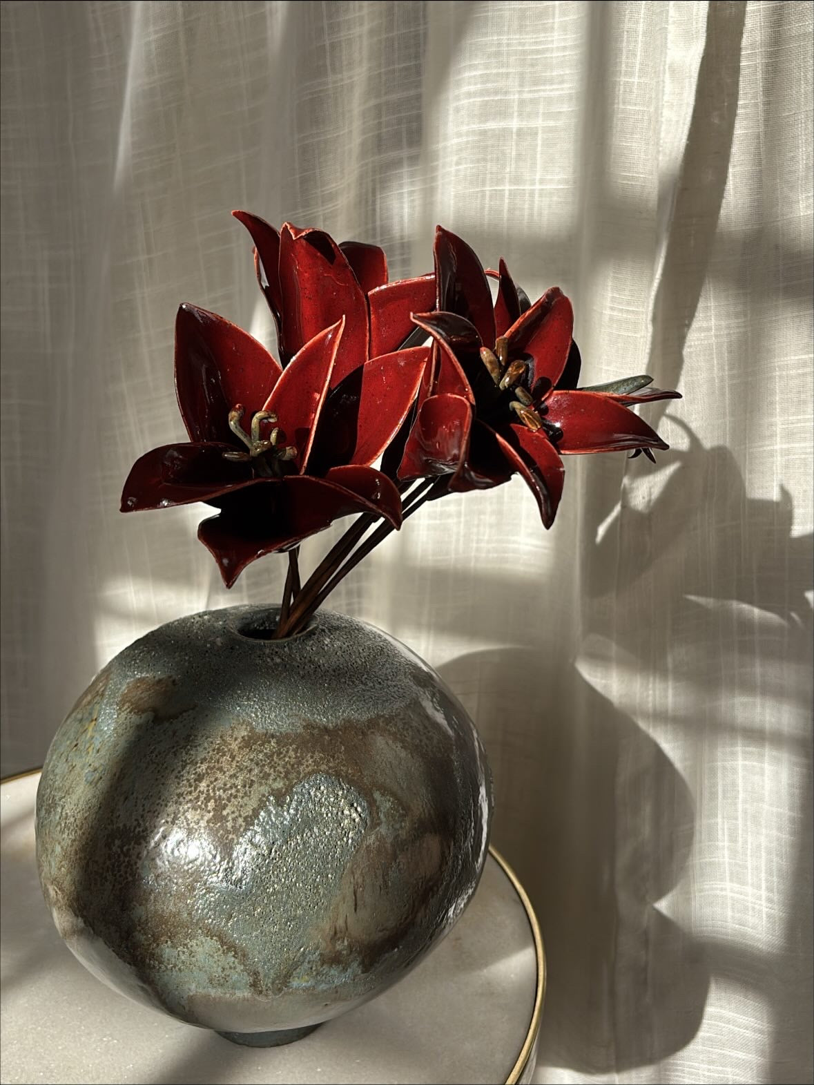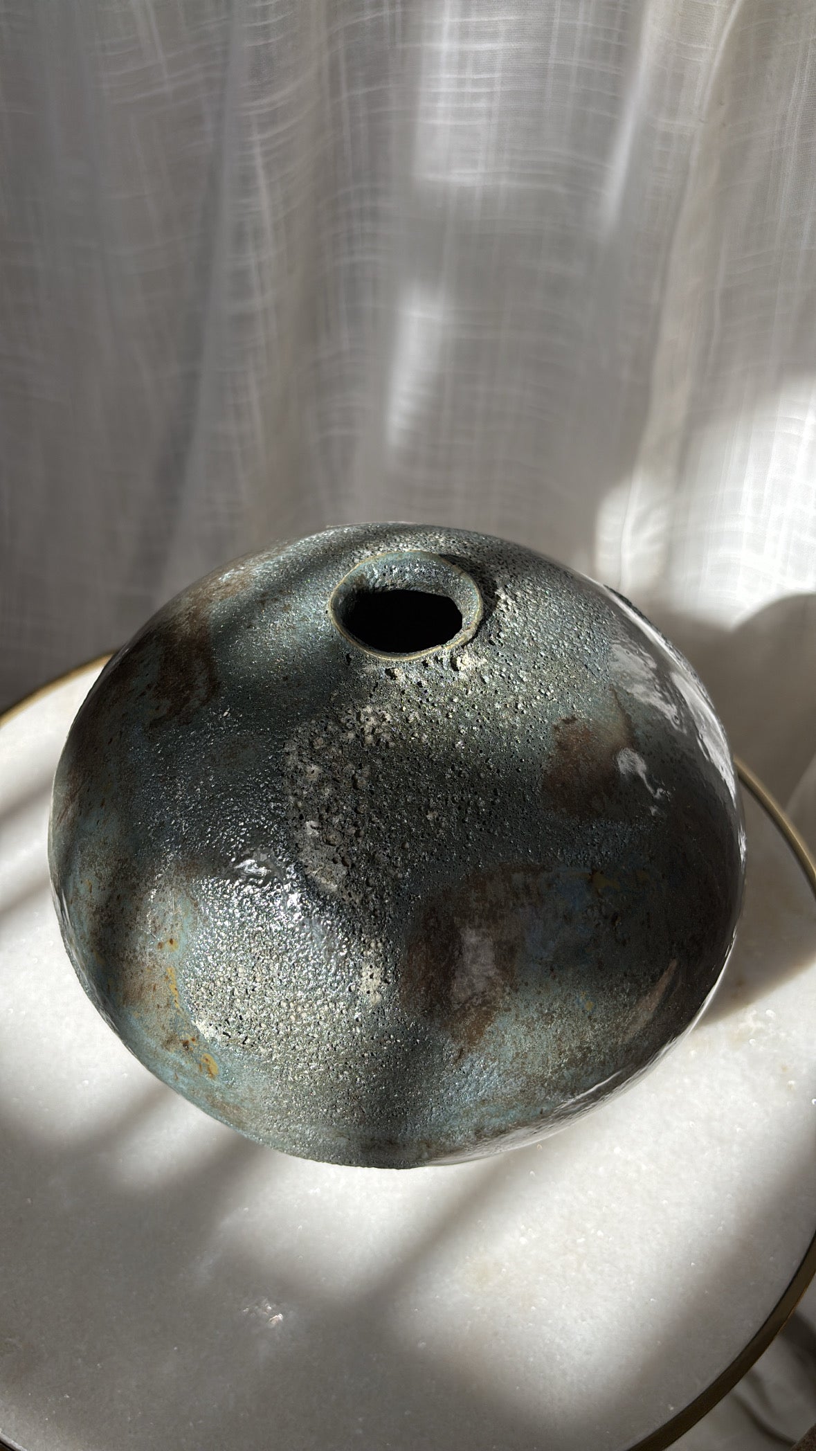 Organic round form with flowing shades of moss green and earthy bronze. A timeless piece that embraces the natural movement of glaze and light. Handmade in stoneware — each vase is one of a kind.