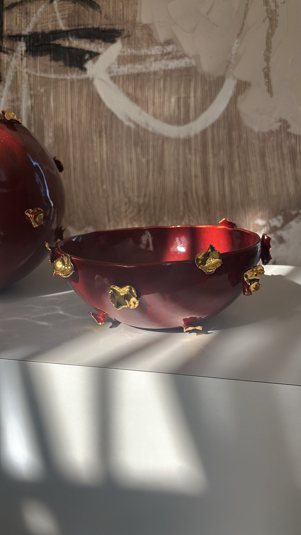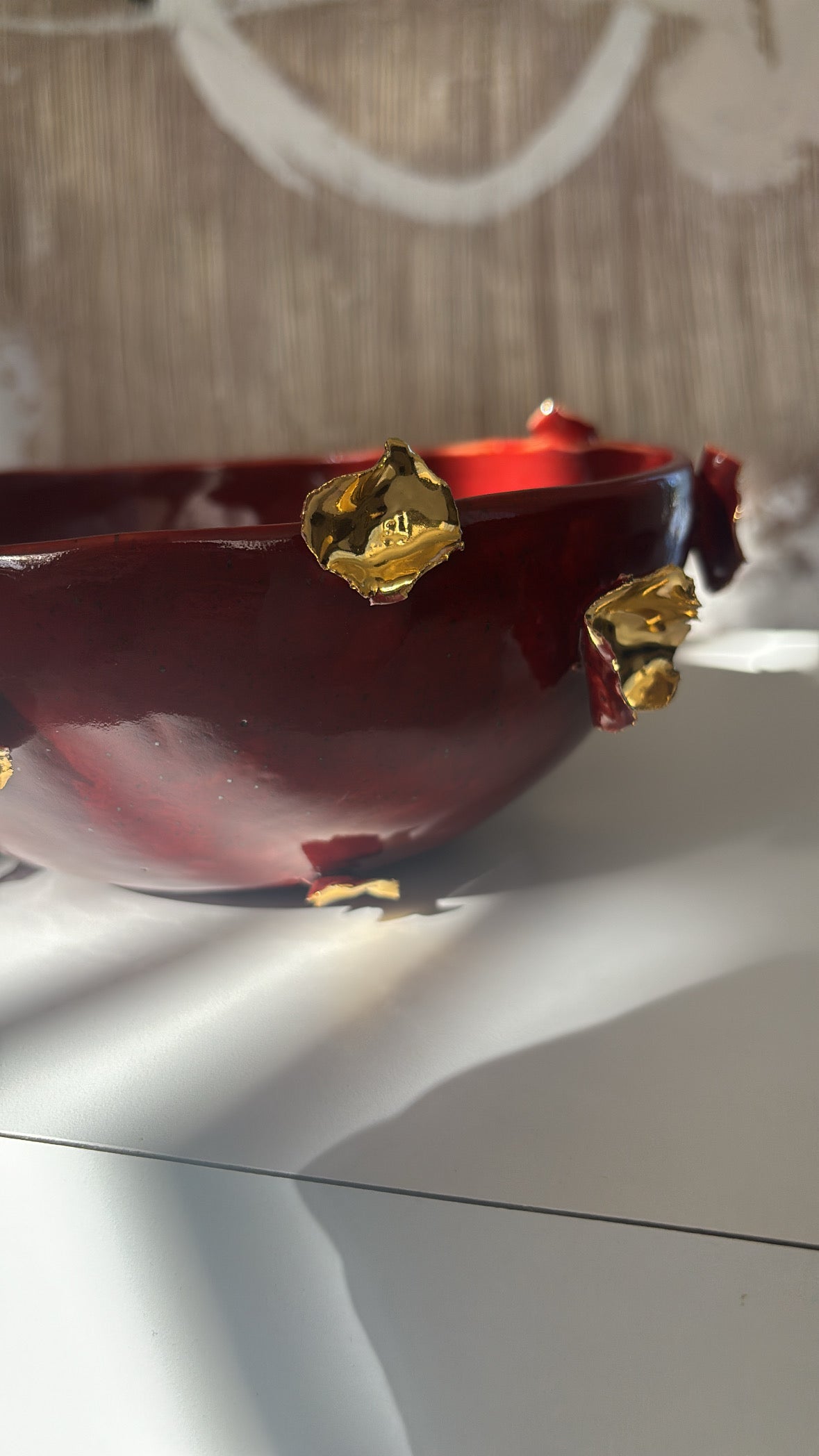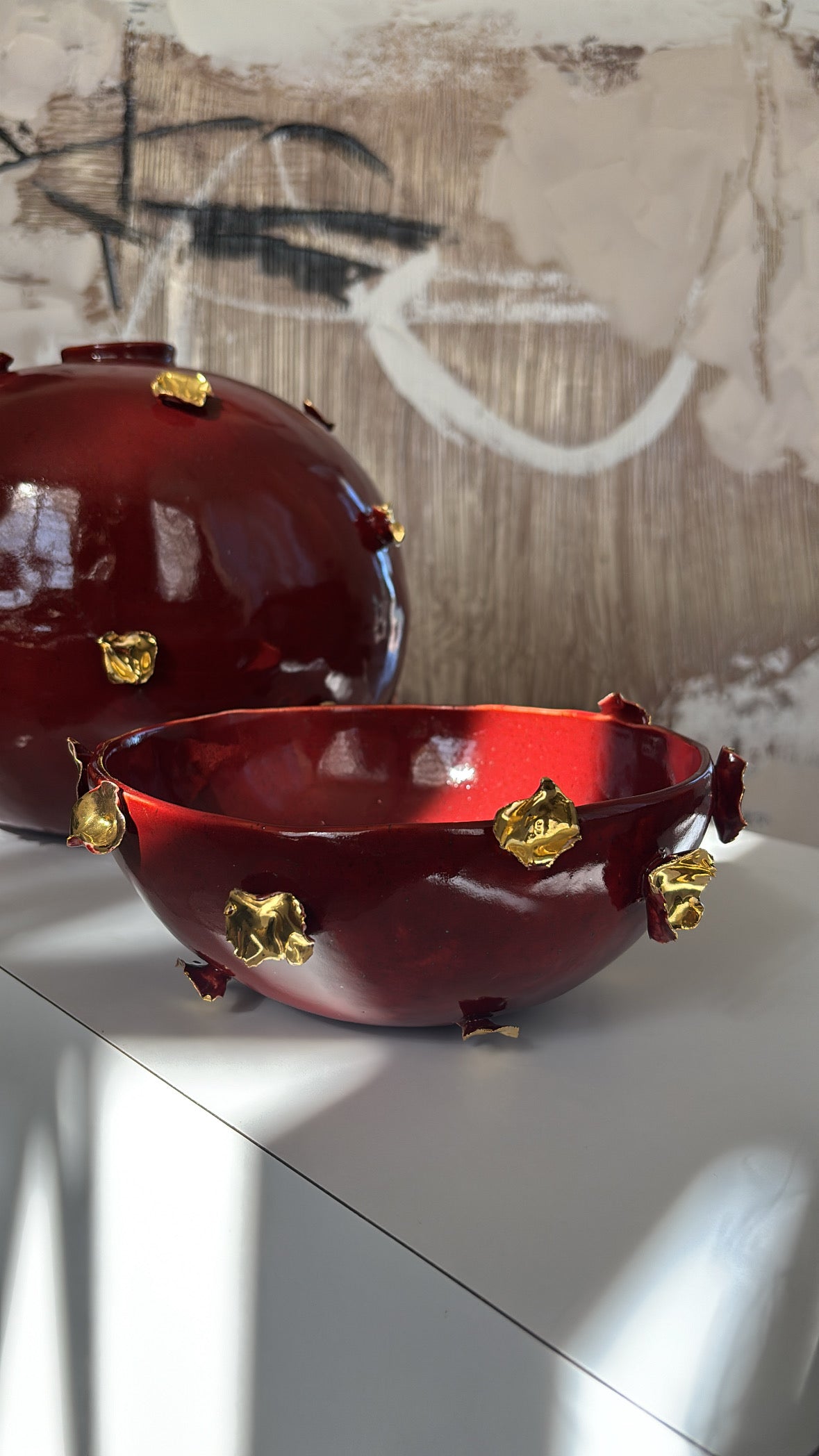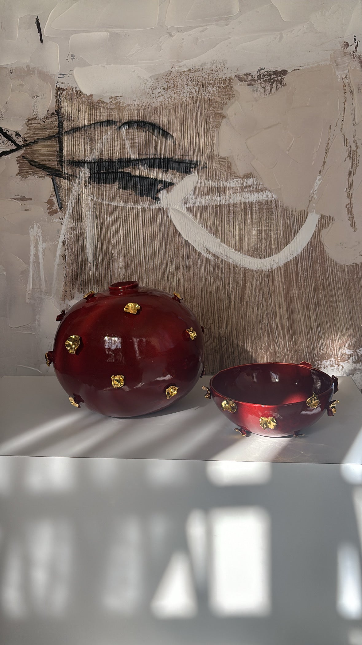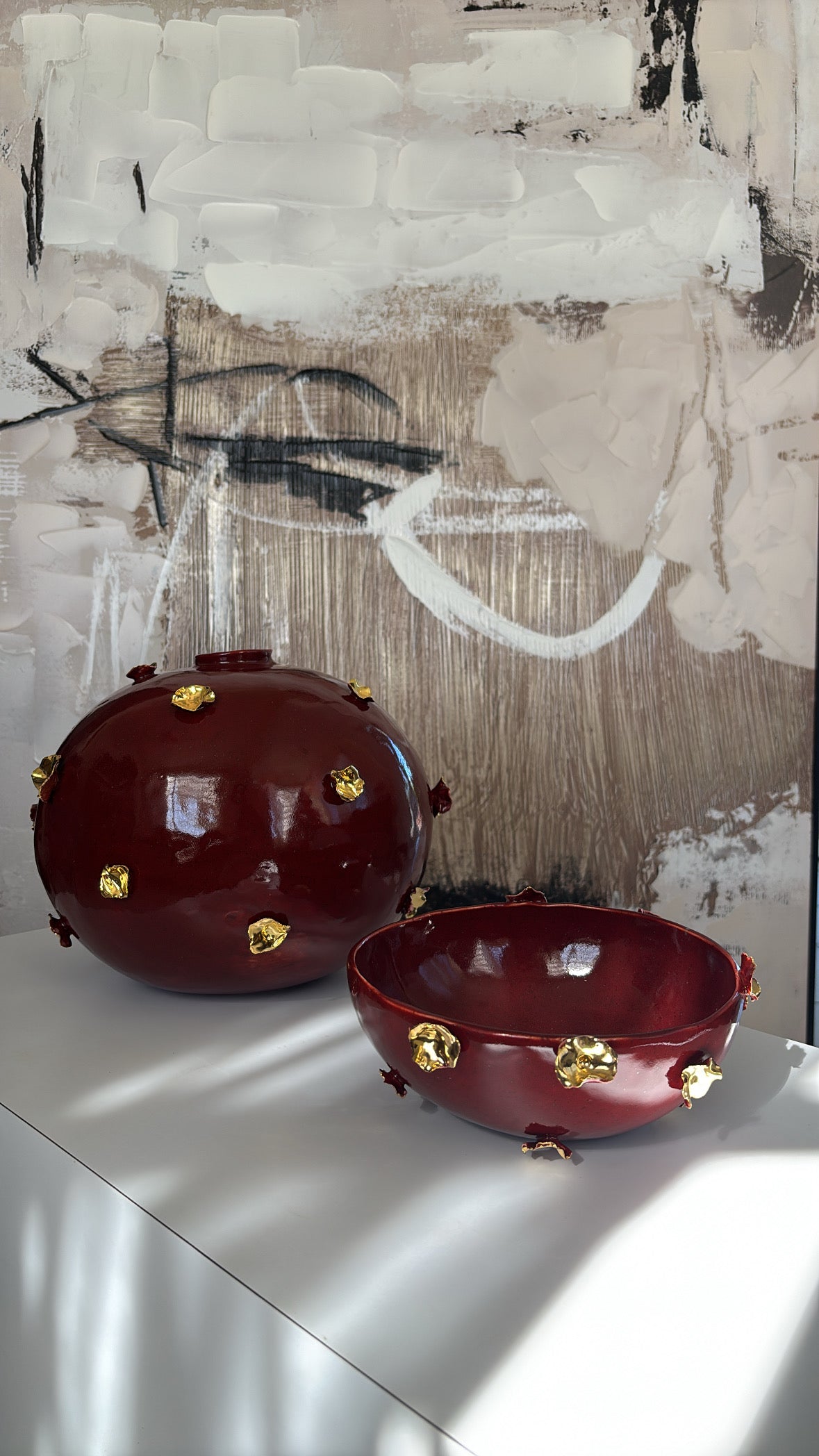 Handcrafted in stoneware to complement the Un Grito de Amor vase, this vessel carries the same profound emotion—an intensity of love that seeks to be expressed even in silence. Its deep wine tones whisper presence and strength, while each 11% real gold accent becomes a quiet spark of devotion, a love so full it gently spills into form. A sculptural companion that radiates warmth, intention, and a longing that cannot be contained.